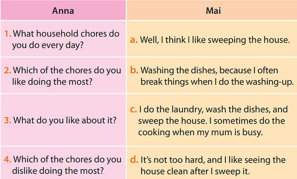 Below is part of Anna’s interview with Mai. They are talking about the household chores Mai likes and dislikes. Match Mai’s answers with Anna’s questions. Then practice the conversation.